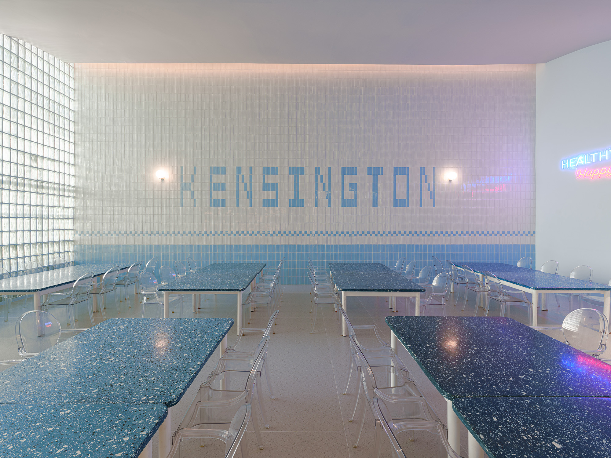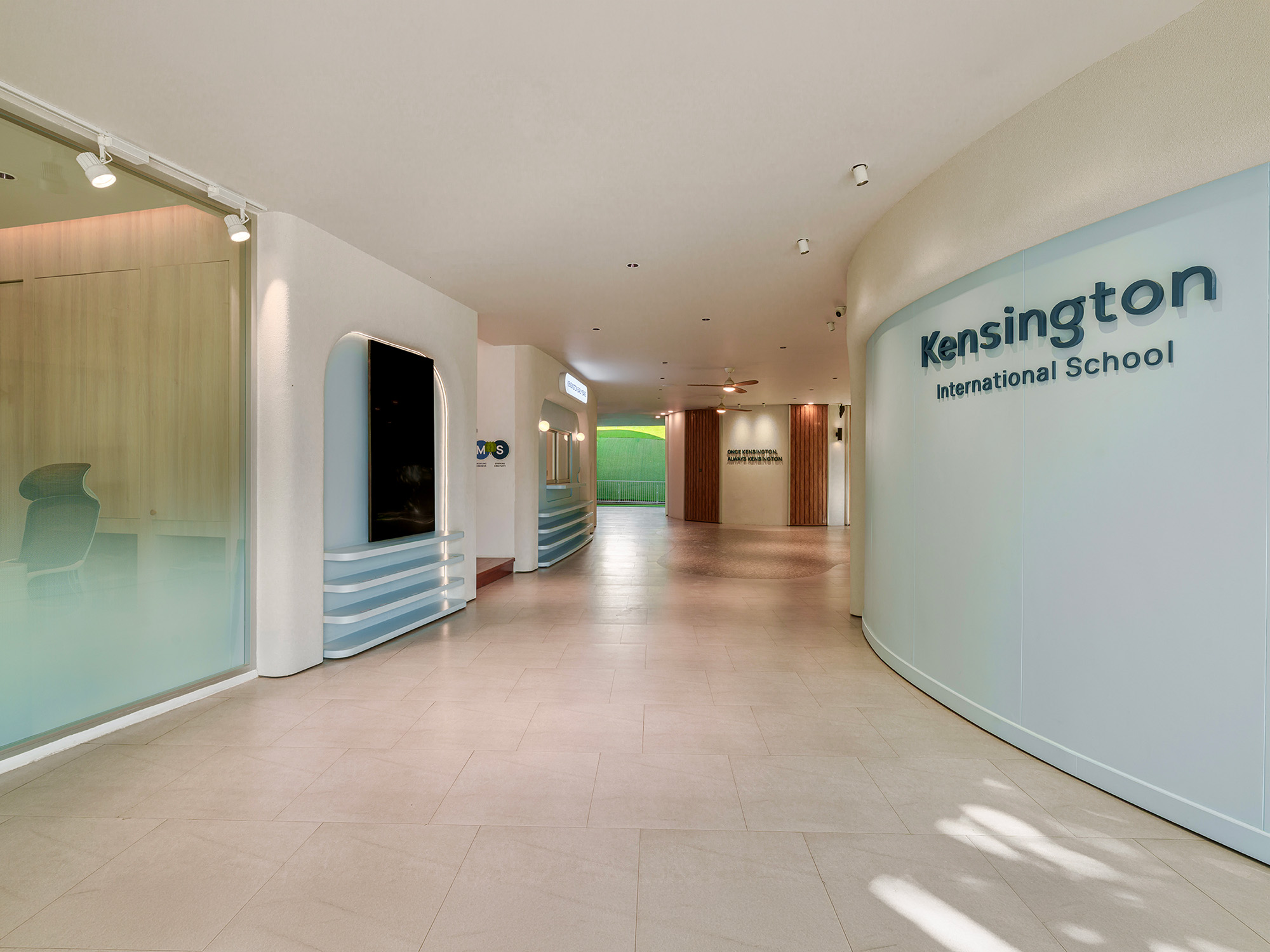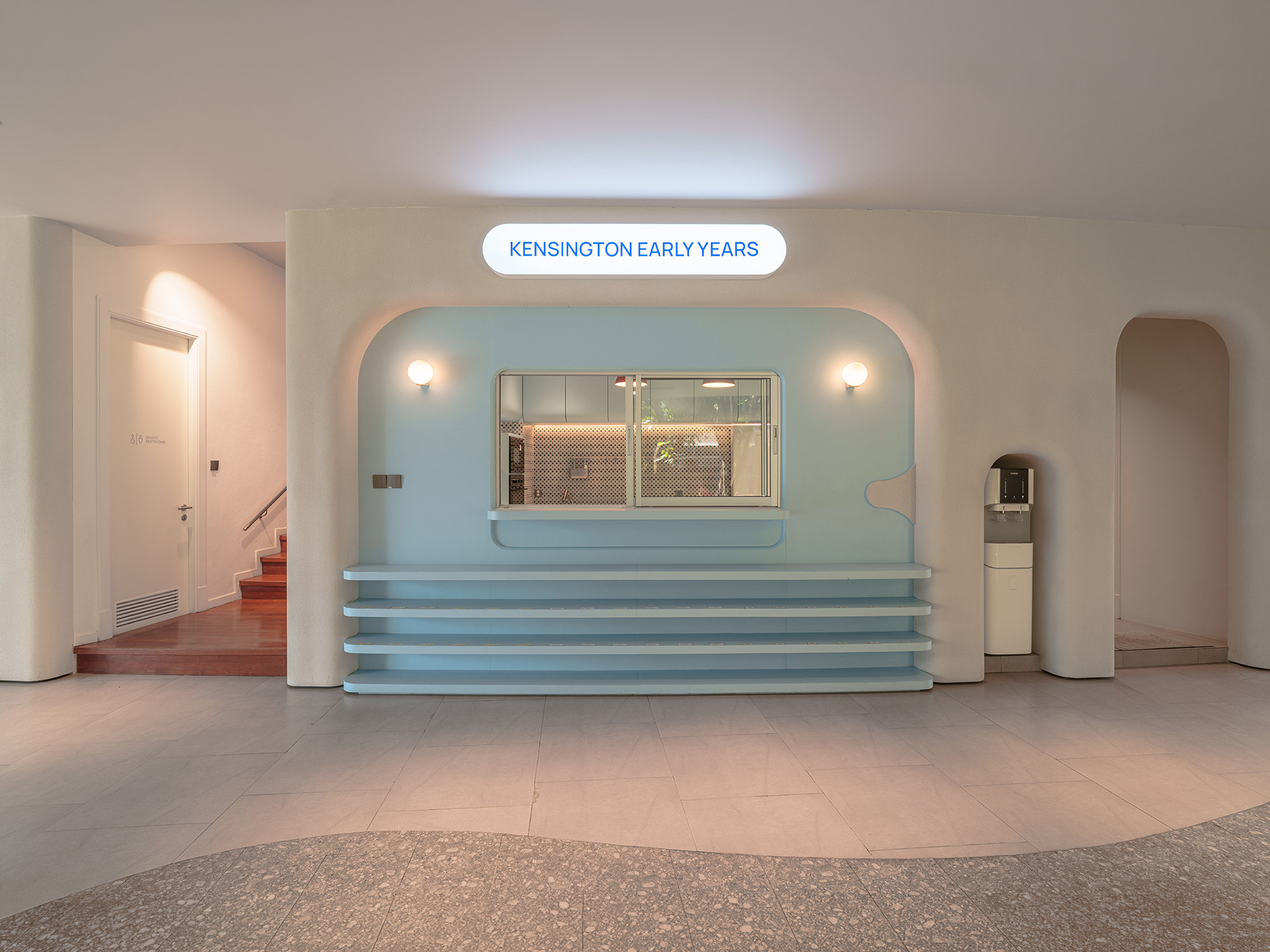 The Entrance Hall features a new curvilinear feature wall that elegantly integrates shoe storage and a Co-Kitchen display, accented by custom neon signage. This fluid language extends into the fully remodeled Co-Kitchen, designed as a professional and clean environment for culinary learning.