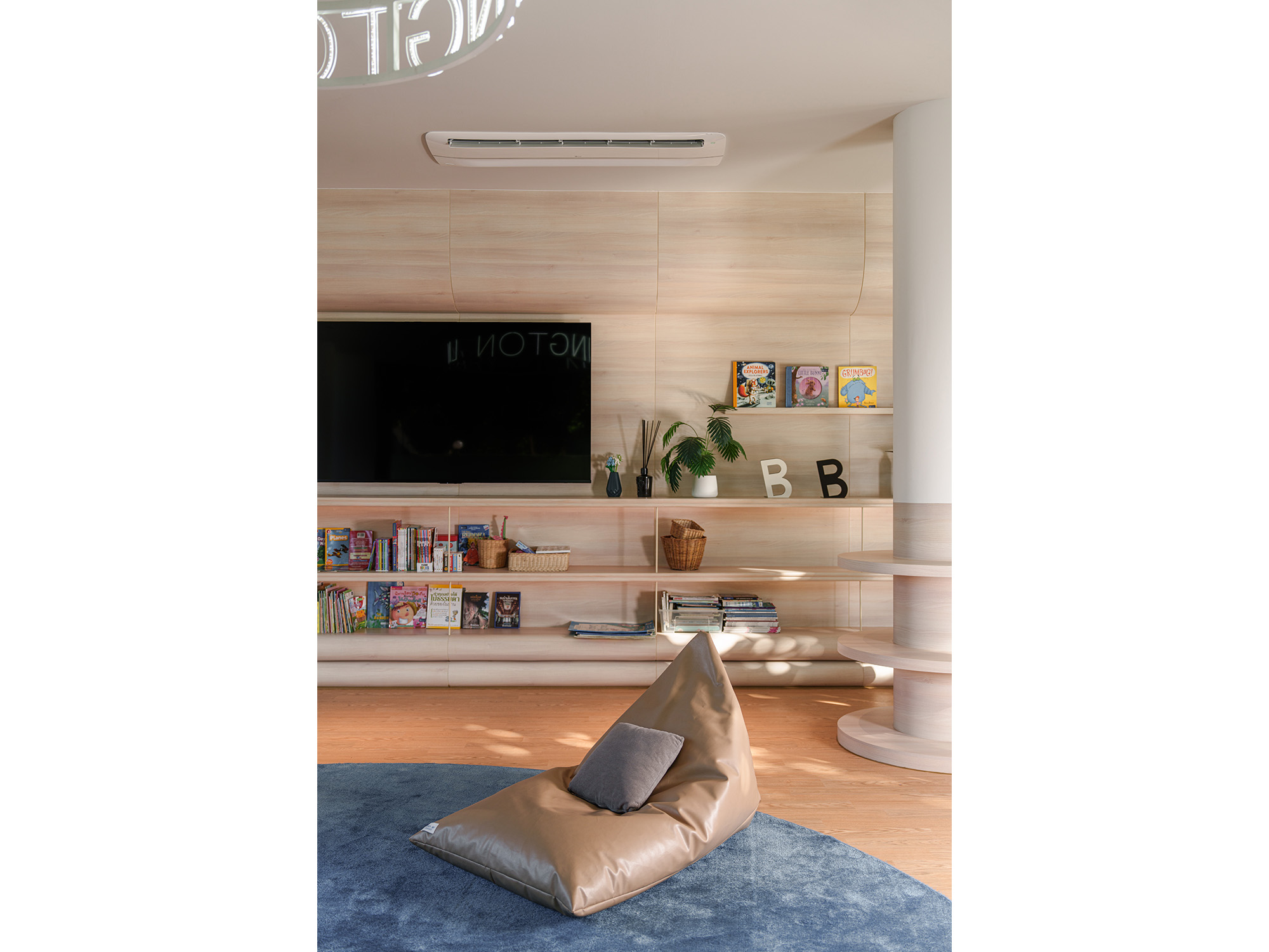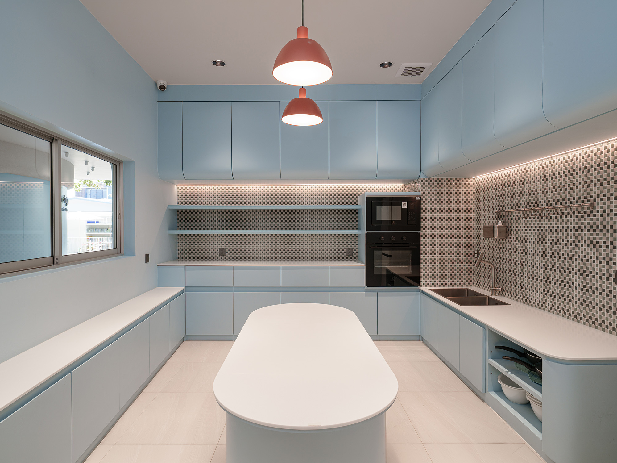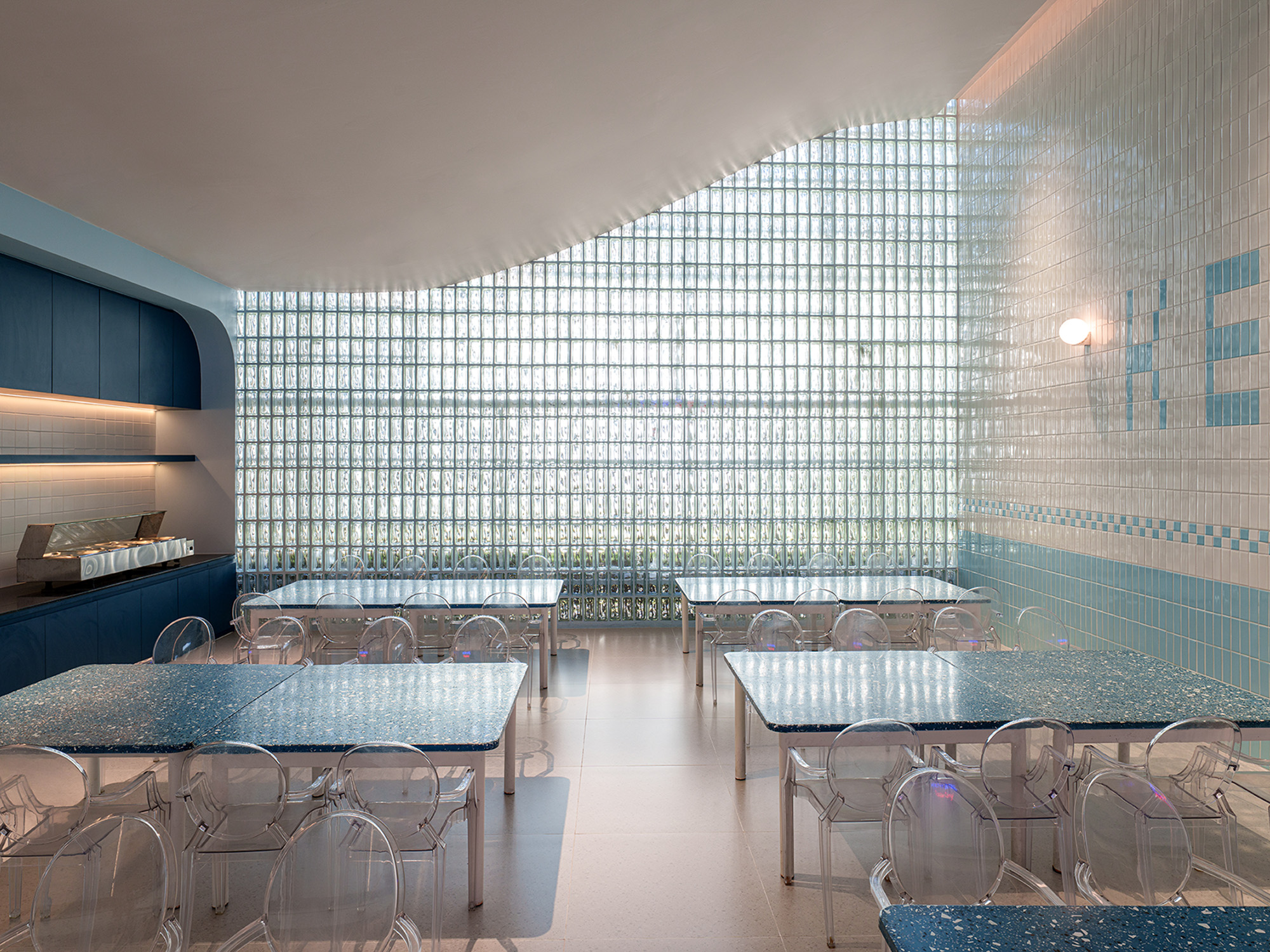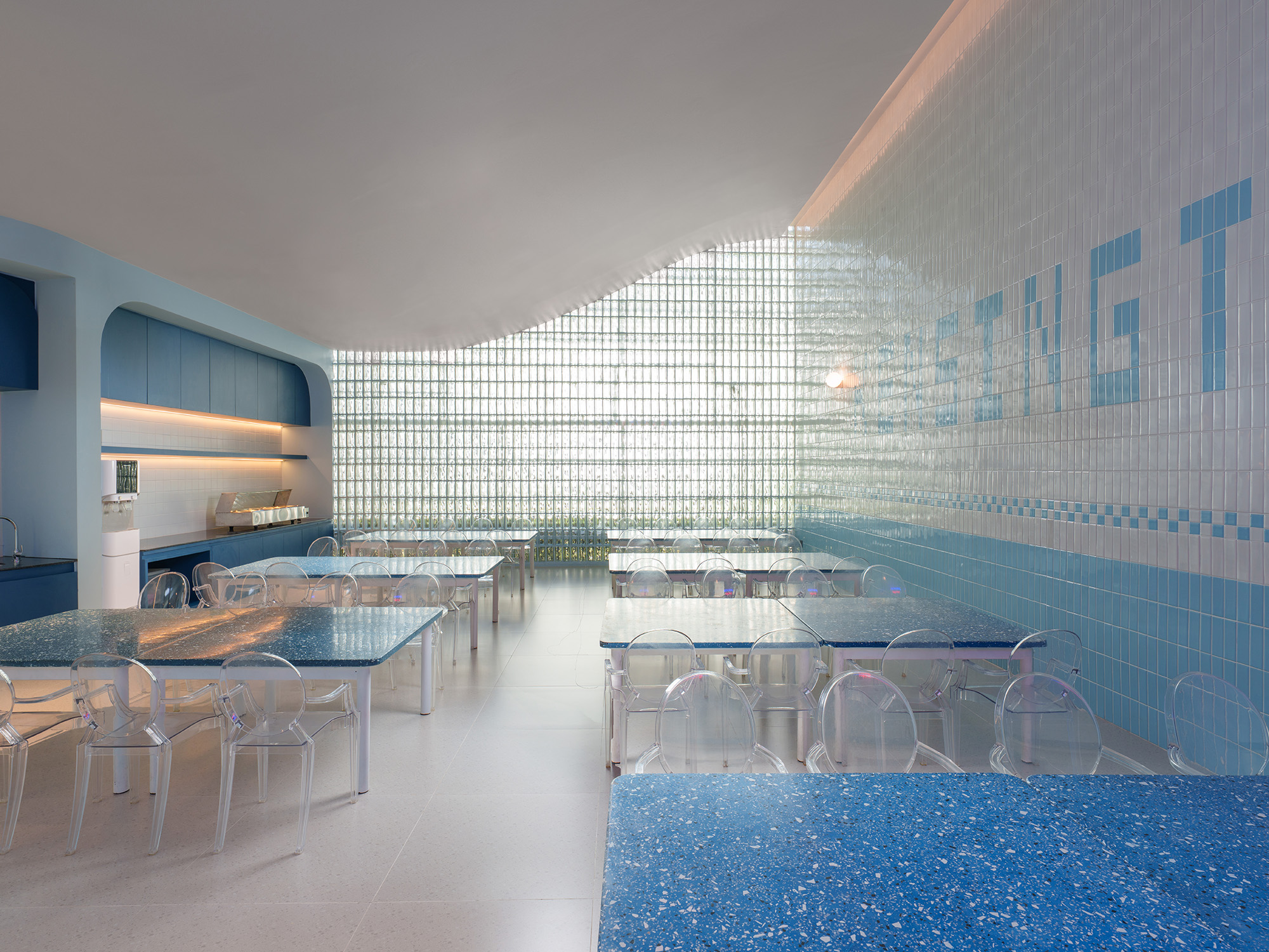 The Entrance Hall features a new curvilinear feature wall that elegantly integrates shoe storage and a Co-Kitchen display, accented by custom neon signage. This fluid language extends into the fully remodeled Co-Kitchen, designed as a professional and clean environment for culinary learning.