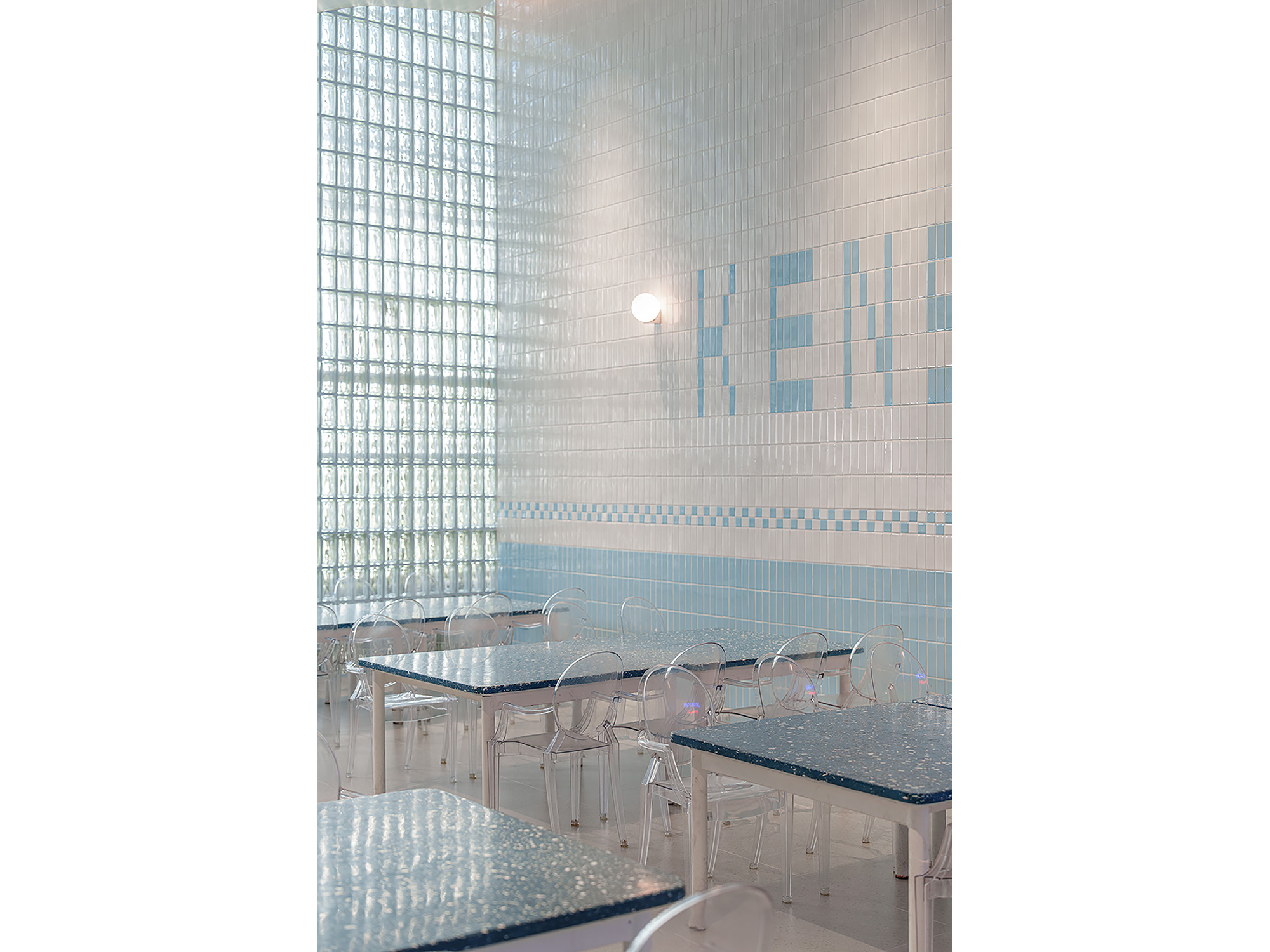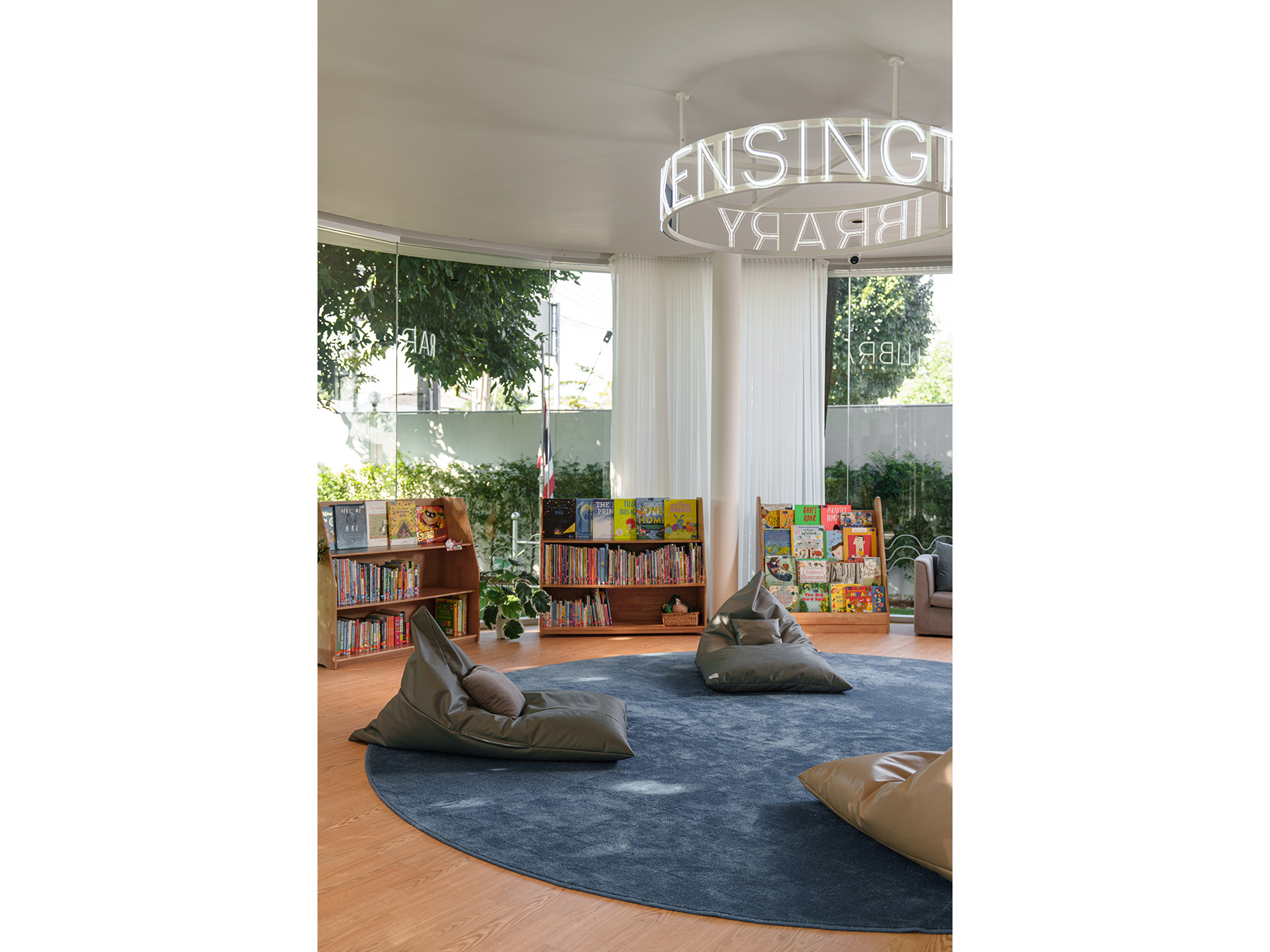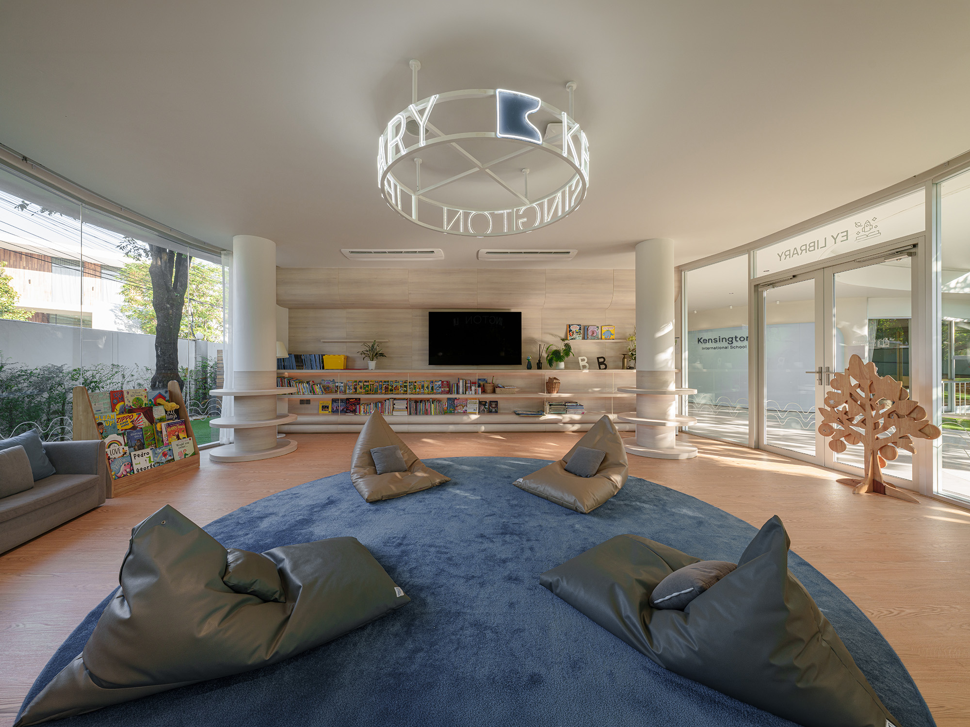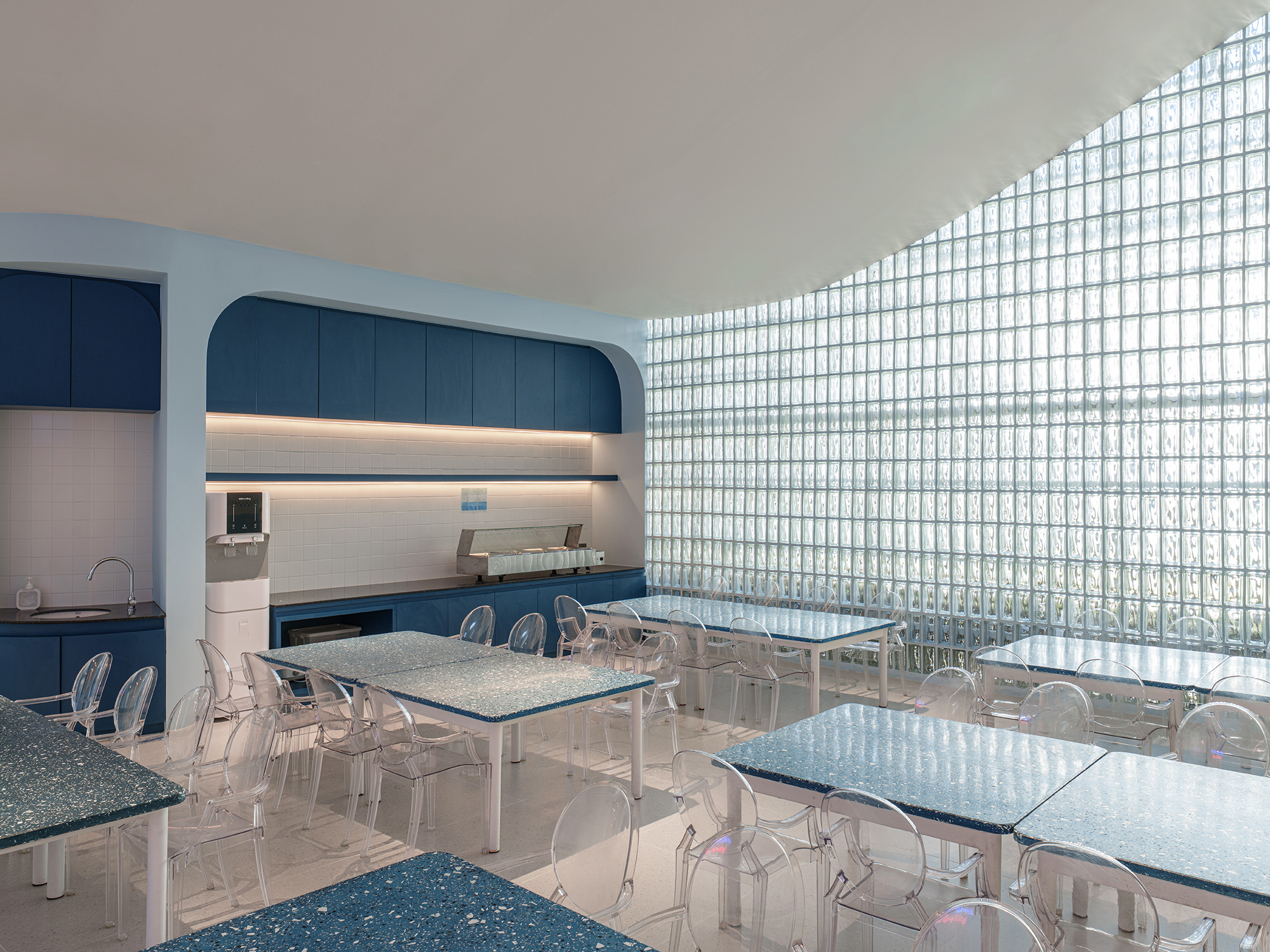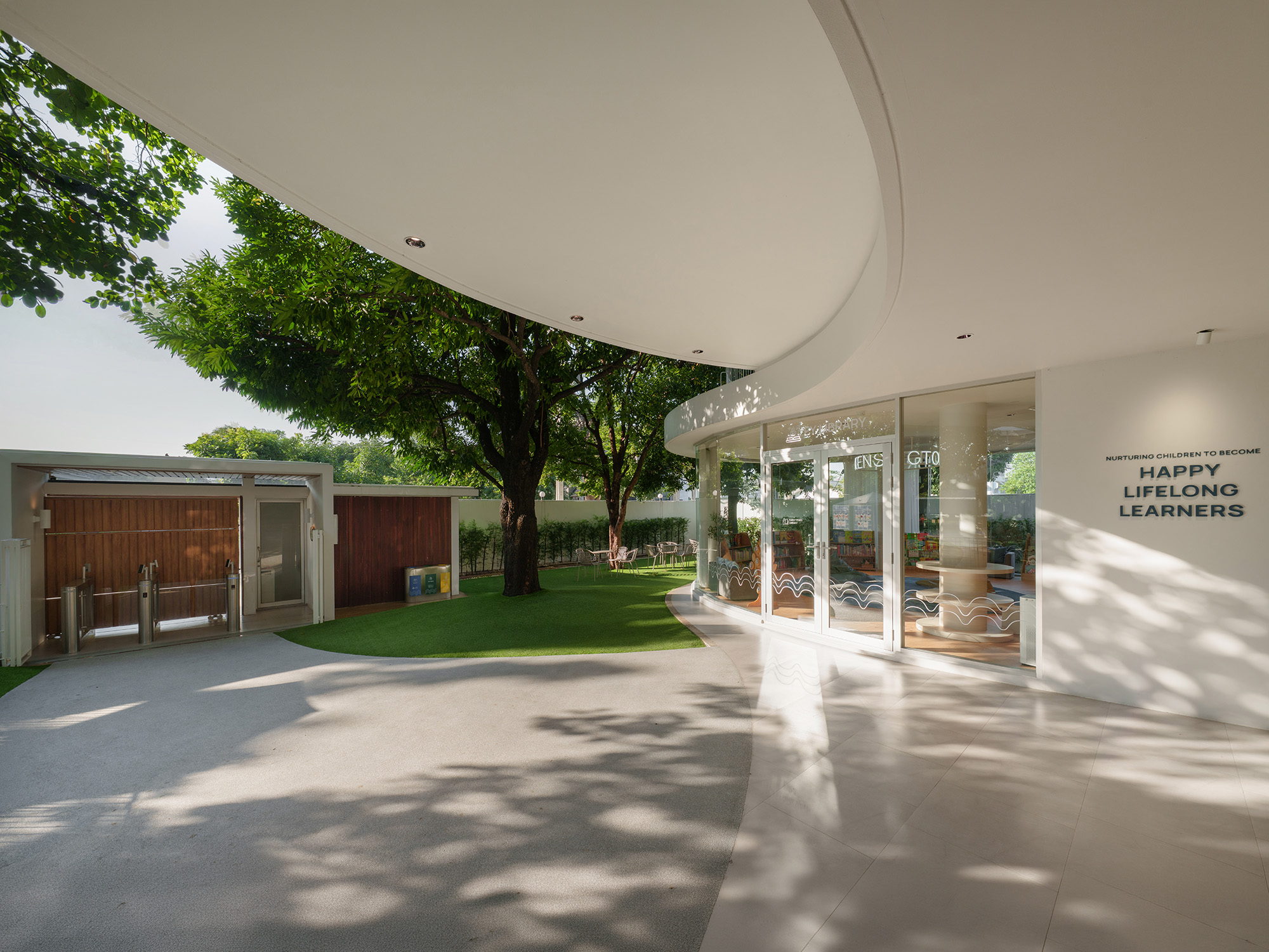 Architectural transparency is highlighted by a Frameless Glass Pavilion for the new library, flooding the space with natural light. To optimize the footprint, the Toddler Gym was relocated to a second-floor volume that mimics the building’s original geometric forms, allowing the former gym to be converted into a vibrant, airy Canteen enhanced by light-harvesting glass block walls.